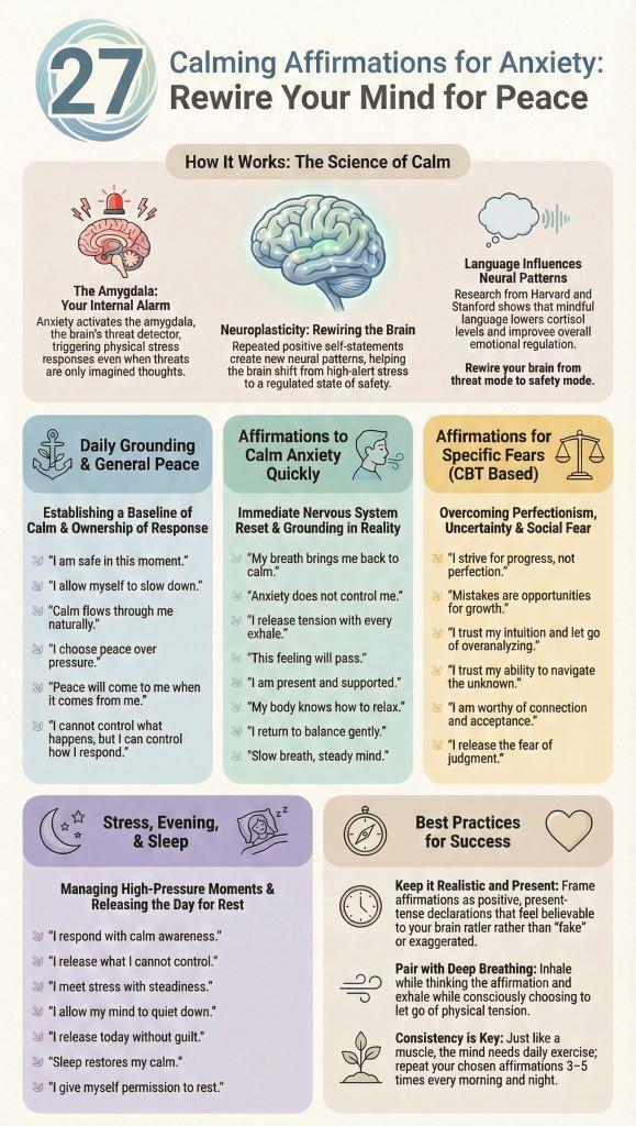 Calming affirmations are not magic words. They are intentional statements that help your brain slow down, reframe stress, and return to balance. Used correctly, they support emotional regulation and reduce anxiety responses over time.
